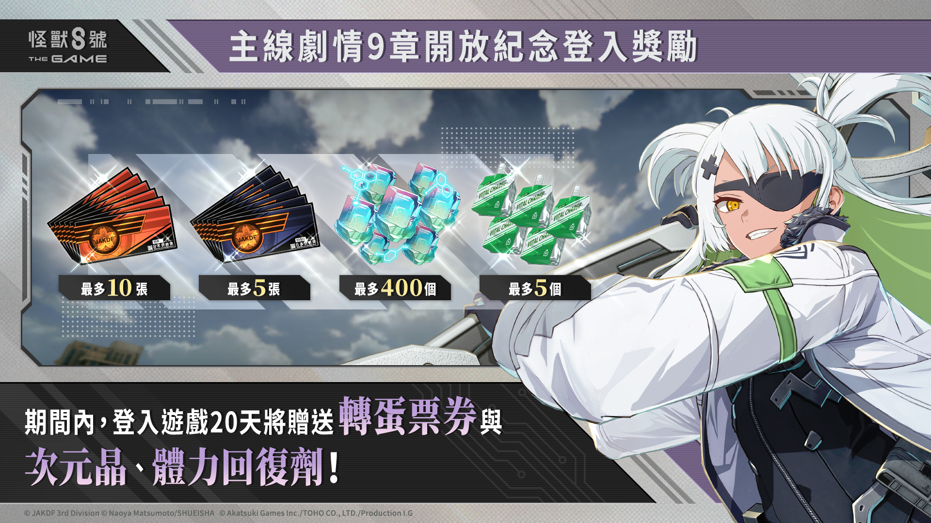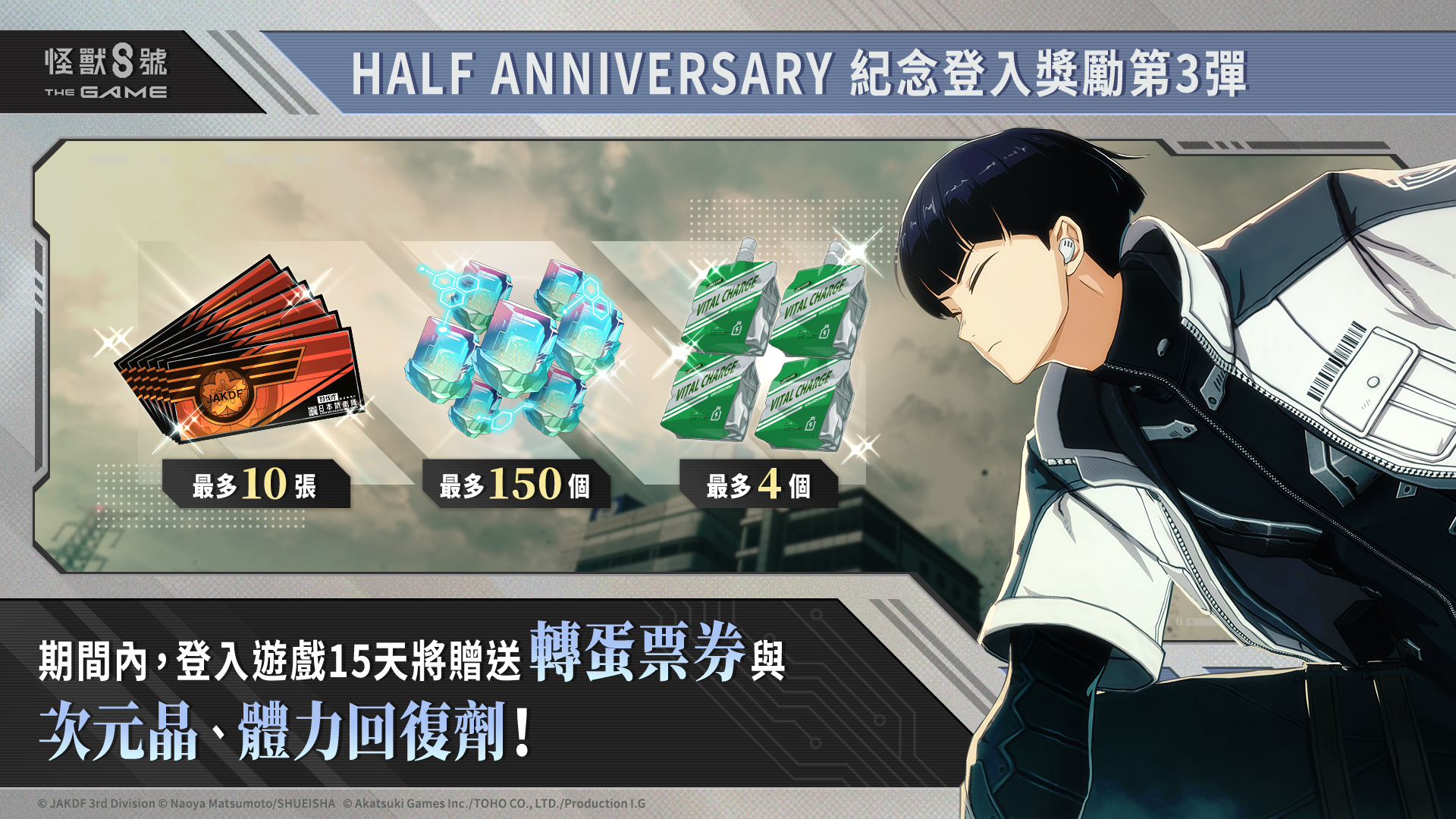由 Akatsuki Games、TOHO 以及 Production I.G, 共同製作的智慧型手機與 PC 遊戲「怪獸 8號 THE GAME」今日宣布半週年慶祝活動第 3 彈正式開放。除了豐富的登入獎勵以外,主線劇情 9 章和全新的迷你番外活動也同步登場!快到遊戲中一睹身穿新戰鬥服的 ★5 角色 [新的可能性]保科宗四郎吧!